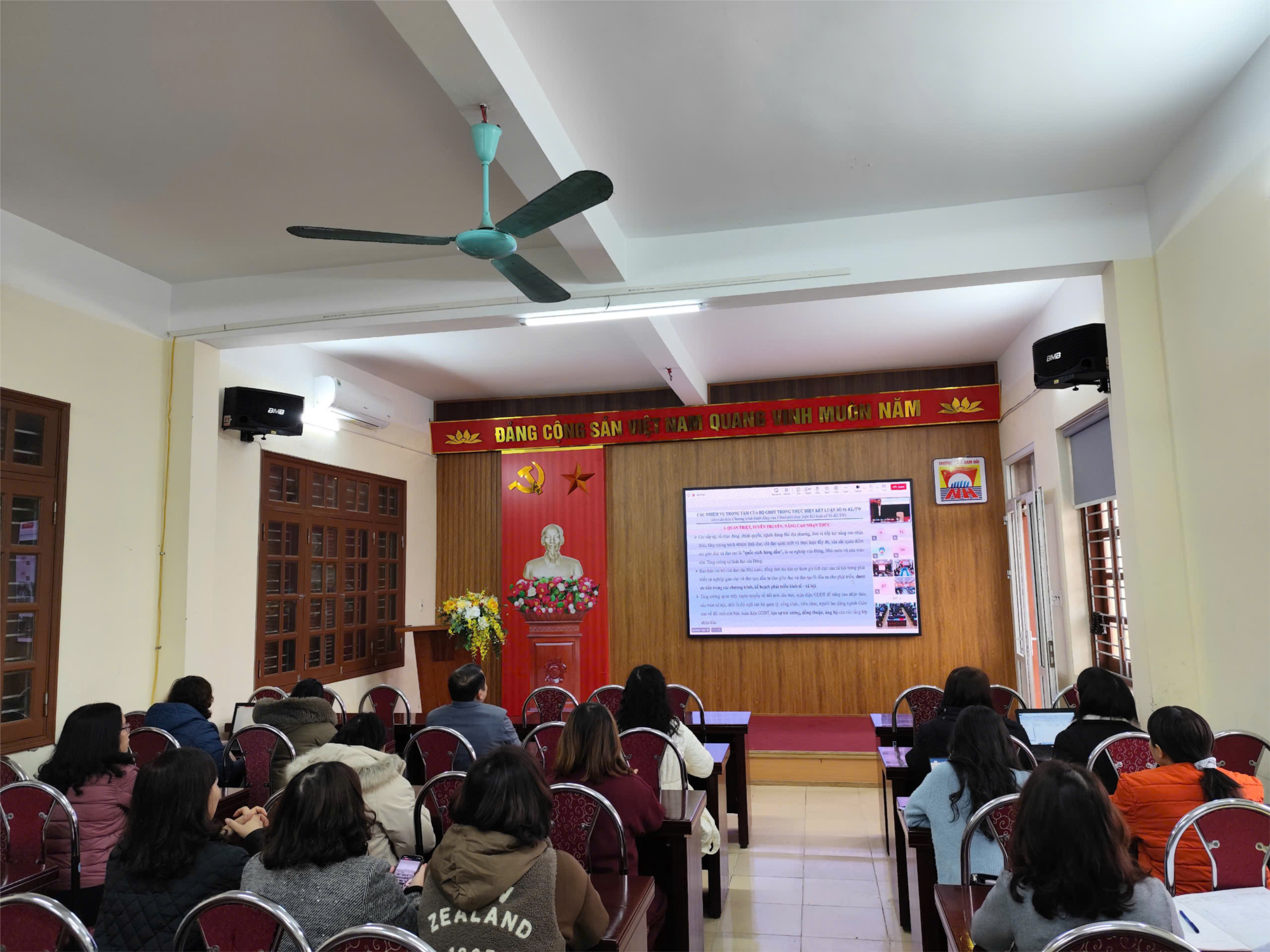 Điểm cầu THCS Nam Hải gồm có: Đ/c Khoa Thị Thu Thủy-Hiệu trưởng, Tạ Văn Đồng-Phó Hiệu trường cùng các giáo viên nhà trường