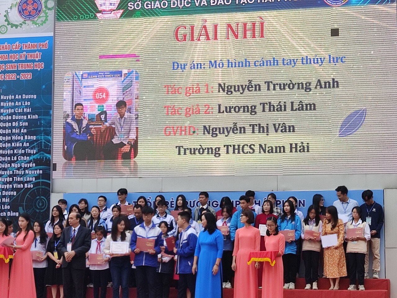 Từ vòng sơ khảo có 235 dự án khoa học thuộc các lĩnh vực đến từ các trường THPT và THCS của thành phố Hải Phòng đến vòng Chung khảo gồm 119 dự án, các em học sinh trường THCS Nam Hải đã rất bản lĩnh, tự tin và thông minh hoàn thành xuất sắc báo cáo khoa học sáng tạo, có tính thực tiễn cao. Dự án là sản phẩm trí tuệ, là tâm huyết, niềm say mê nghiên cứu khoa học của các em học sinh Nguyễn Trường Anh và Lương Thái Lâm- Lớp 9A2 với dự án “Mô hình cánh tay thủy lực” lĩnh vực Kỹ thuật cơ khí và cô giáo Nguyễn Thị Vân hướng dẫn.