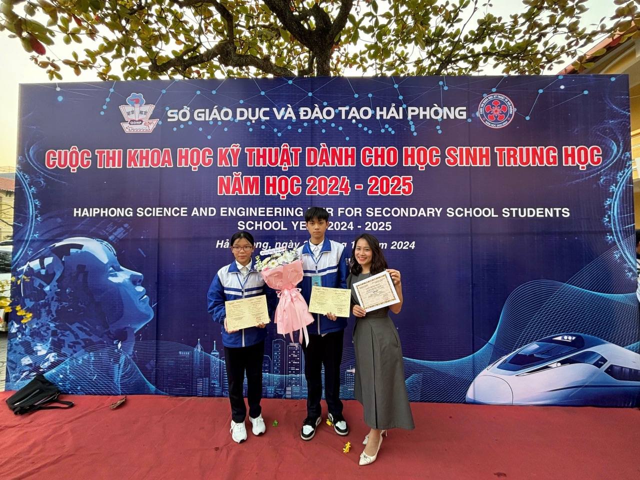 Cuộc thi nghiên cứu Khoa học, Kĩ thuật cấp Thành phố đã diễn ra trọn vẹn với mục đích khuyến khích các bạn học sinh tiếp xúc với khoa học và áp dụng vào thực tiễn. Trong cuộc thi vừa qua, sản phẩm thuộc lĩnh vực Khoa học xã hội và hành vi của hai bạn: Trần Đức Hoàng và Nguyễn Khánh Ngân - học sinh lớp 8B5 do cô giáo Nguyễn Thị Mai Phương hướng dẫn đã đạt giải Ba.