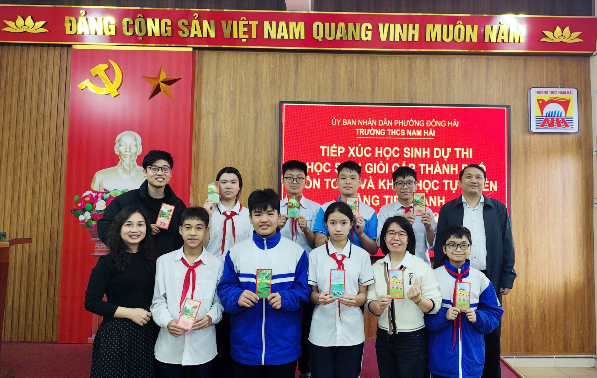Chiều ngày 27/01/2026, Trường THCS Nam Hải đã tổ chức chương trình tiếp xúc, gặp mặt đội tuyển học sinh tham gia Kỳ thi học sinh giỏi cấp thành phố môn Toán và Khoa học Tự nhiên bằng tiếng Anh tại hội trường nhà trường. Chương trình diễn ra trong không khí trang trọng, ấm áp và đầy quyết tâm, thể hiện sự quan tâm sâu sắc của Ban Giám hiệu và các thầy cô giáo đối với các em học sinh đội tuyển.