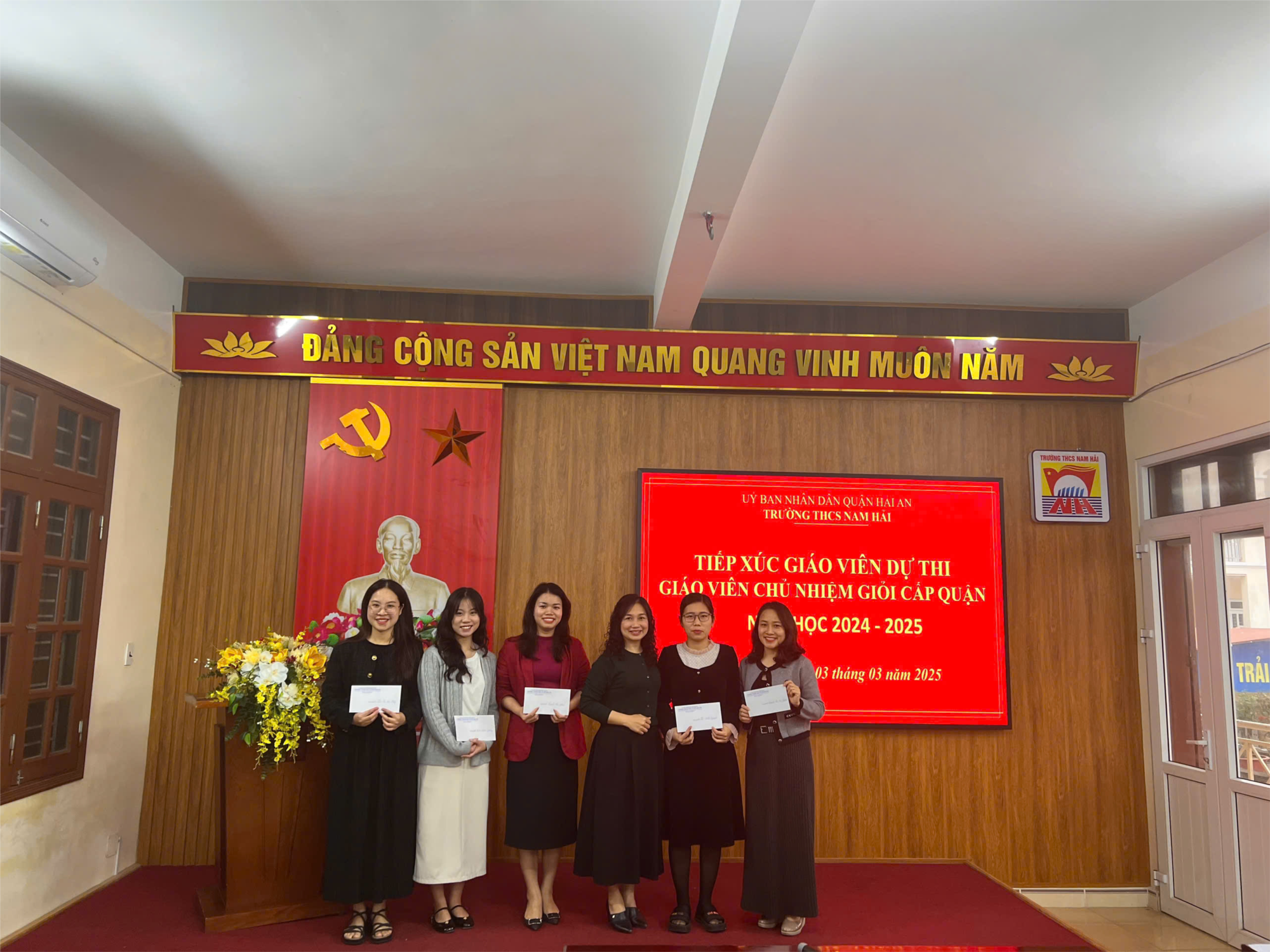 Đã từ lâu, trường THCS Nam Hải luôn có phong trào tích cực trong hội thi, nhiều GV đăng ký và đạt giải trong các Hội thi GVG, Hội thi về công tác chuyên môn. Tại Hội thi Giáo viên chủ nhiệm lớp giỏi cấp quận bậc THCS năm học 2024-2025, trường THCS Nam Hải có 05 giáo viên đủ điều kiệm tham gia Hội thi gồm các đ/c Nguyễn Thị Phúc, Lưu Thị Thu Thủy, Lê Thị Ánh Nguyệt, Trần Minh Phương, Nguyễn Thị Mai Phương. Chúc các đ/c bình tĩnh, tự tin, phát huy tốt khả năng chuyên môn để đạt kết quả cao nhất trong Hội thi.