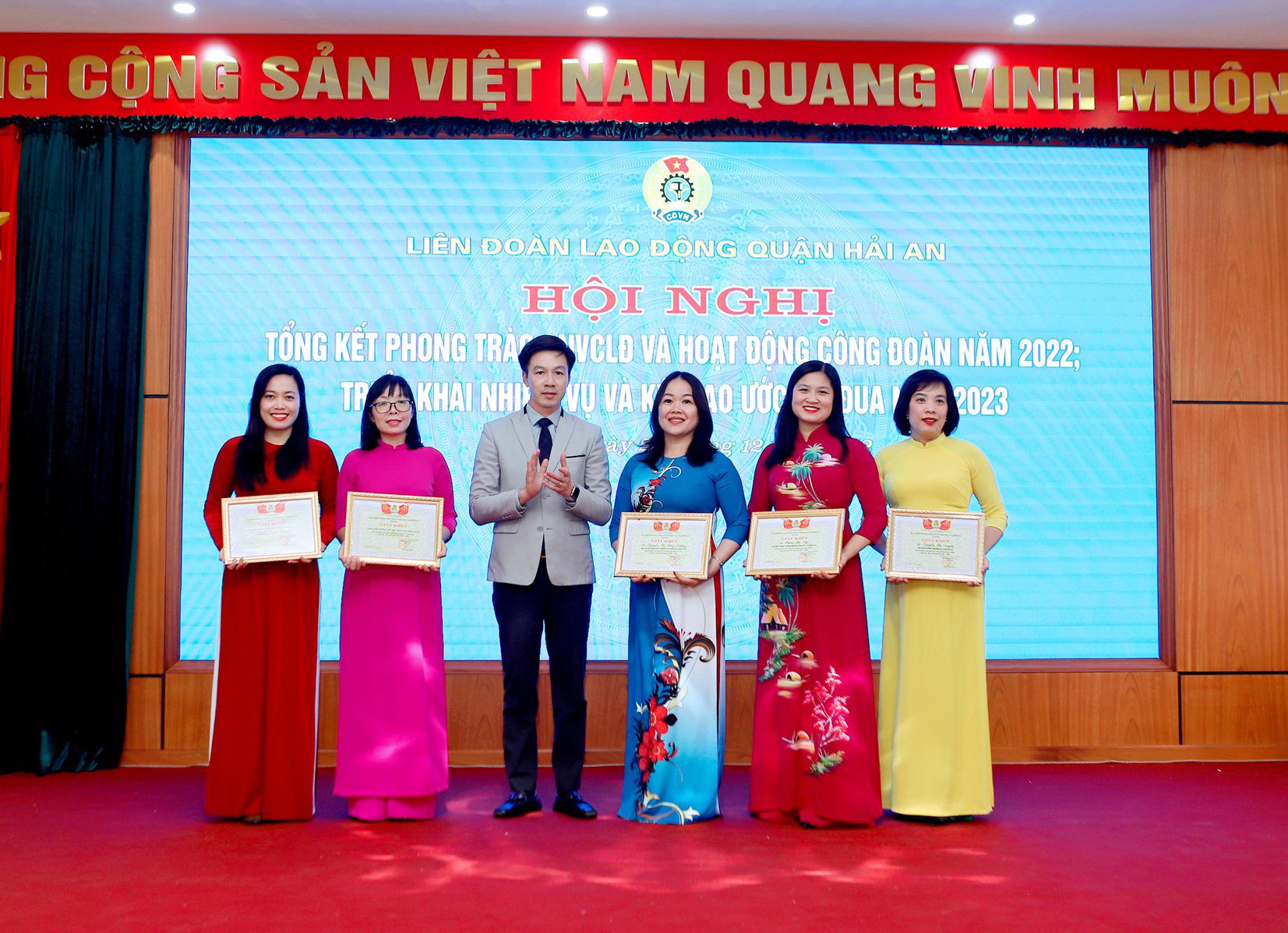 Thực hiện Chương trình công tác năm 2022, được sự nhất trí của Thường trực LĐLĐ thành phố, Thường trực Quận ủy Hải An; Ban Thường vụ LĐLĐ quận Hải An tổ chức Hội nghị tổng kết công tác Công đoàn và phong trào CNVCLĐ, biểu dương các tập thể và cá nhân được khen thưởng năm 2022, triển khai nhiệm vụ và ký giao ước thi đua năm 2023.