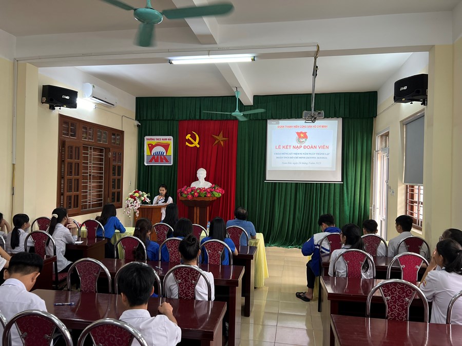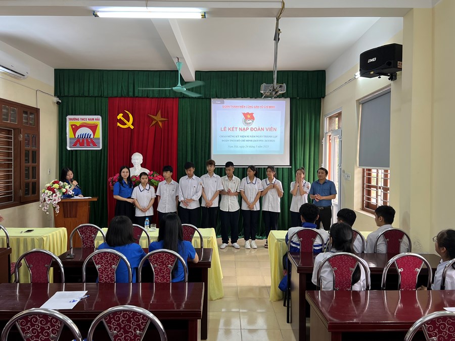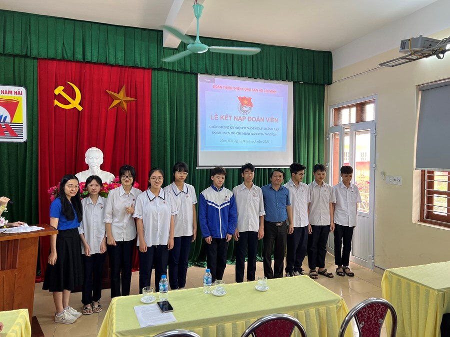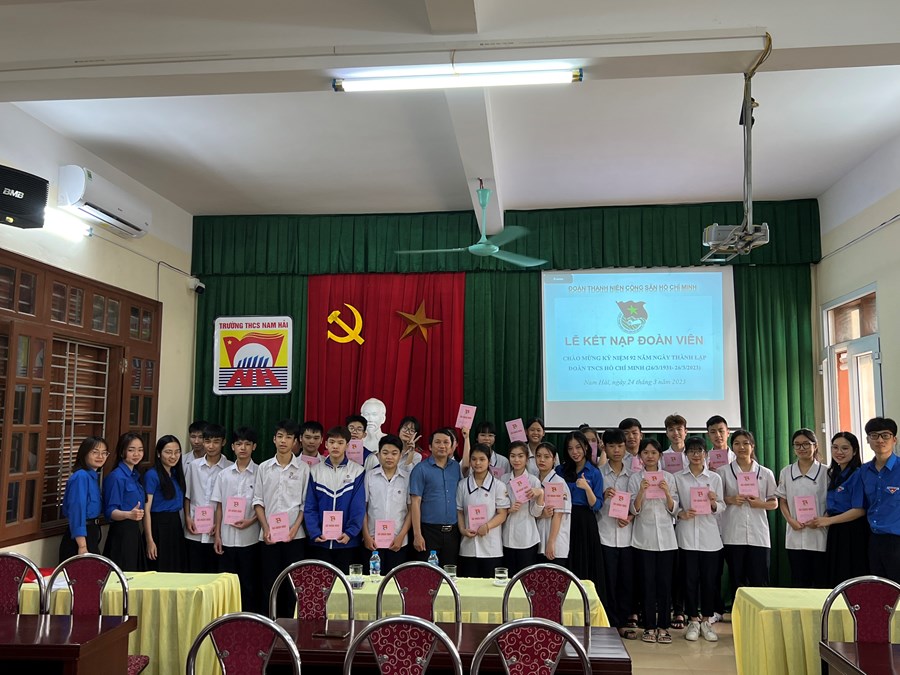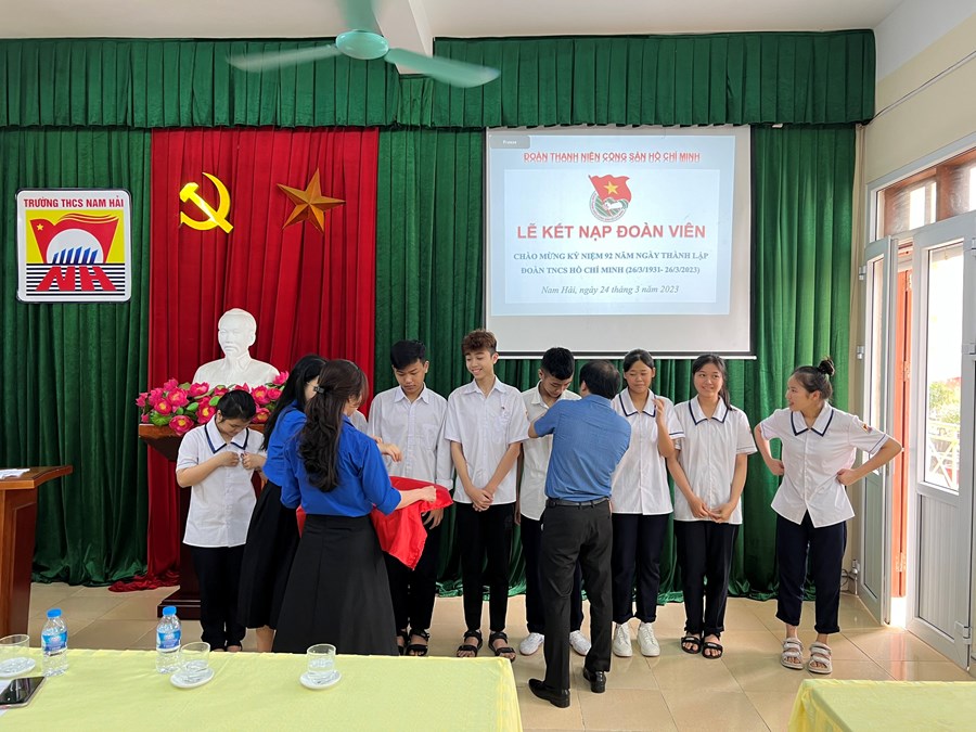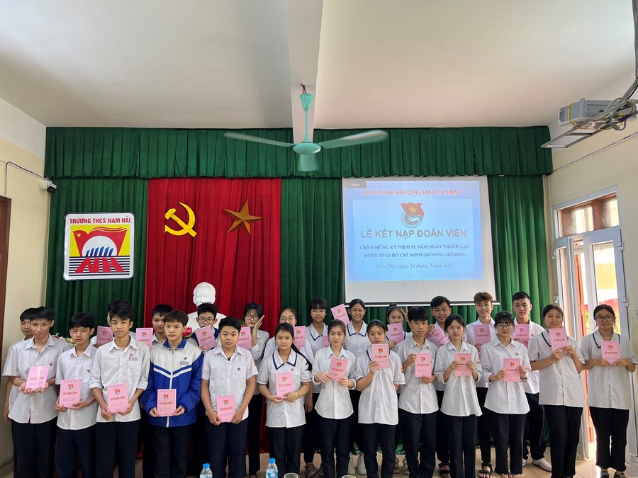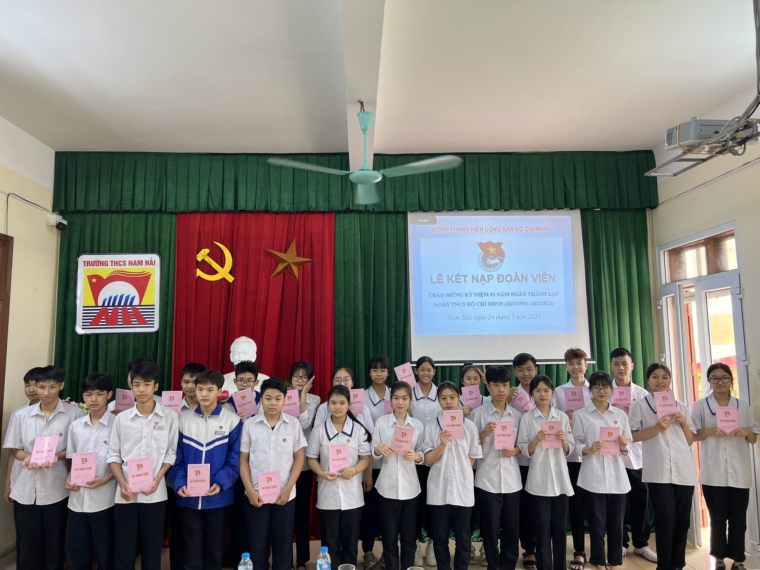 Trong không khí sôi nổi của tuổi trẻ cả nước thi đua lập thành tích chào mừng kỷ niệm 92 năm ngày thành lập Đoàn TNCS Hồ Chí Minh (26/3/1931- 26/3/2023). Nằm trong chuỗi các hoạt động tổ chức “Chào mừng kỷ niệm 92 năm ngày thành lập Đoàn TNCS Hồ Chí Minh”, đồng thời nhằm đẩy mạnh công tác giáo dục truyền thống yêu nước, lý tưởng cách mạng thanh niên, nâng cao nhận thức về Đoàn TNCS Hồ Chí Minh. Được sự quan tâm chỉ đạo của Ban giám hiệu nhà trường, Đoàn TNCS HCM trường THCS Nam Hải đã triển khai một số hoạt động để chào mừng ngày lễ lớn. Đặc biệt sáng ngày 23/3/2023 tại trường THCS Nam Hải, chi đoàn đã tổ chức Lễ kết nạp đoàn viên mới cho 25 thanh niên ưu tú. Buổi lễ được tổ chức trong không khí trang nghiêm, long trọng, đúng trình tự và hướng dẫn thực hiện Điều lệ Đoàn.