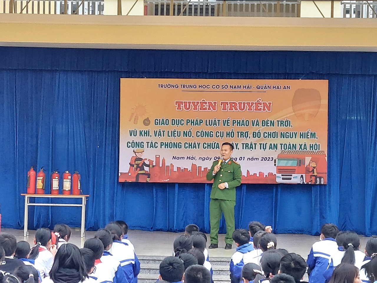 Để nâng cao kiến thức về quản lý, sử dụng pháo; phòng cháy chữa cháy, hôm nay ngày 9/1/2023, Trường THCS Nam Hải phối hợp cùng với công an thành phố Hải Phòng tổ chức buổi Tuyên truyền giáo dục pháp luật về pháo và đèn trời, vũ khí, vật liệu nổ, công cụ hỗ trợ, đồ chơi nguy hiểm, công tác phòng cháy chữa cháy, trật tự an toàn xã hội cho CB-GV-NV và học sinh nhà trường.