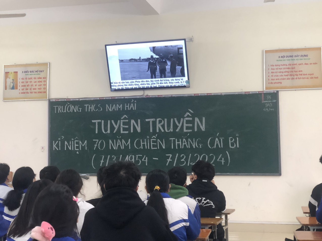 Thực hiện Kế hoạch tổ chức các hoạt động tuyên truyền kỷ niệm 70 năm Chiến thắng Cát Bi (07/3/1954 - 07/3/2024) gắn với kỷ niệm 70 năm Chiến thắng Điện Biên Phủ (07/5/1954 - 07/5/2024); Công văn số 178 - CV/BTGQU ngày 16/02/2024 của Ban Tuyên giáo Quận uỷ về việc tuyên truyền kỷ niệm 70 năm Ngày Chiến thắng Cát Bi (07/3/1954 - 07/3/2024), Trường THCS Nam Hải thực hiện các hoạt động ý nghĩa nhằm kỉ niệm 70 năm ngày Chiến thắng Cát Bi.