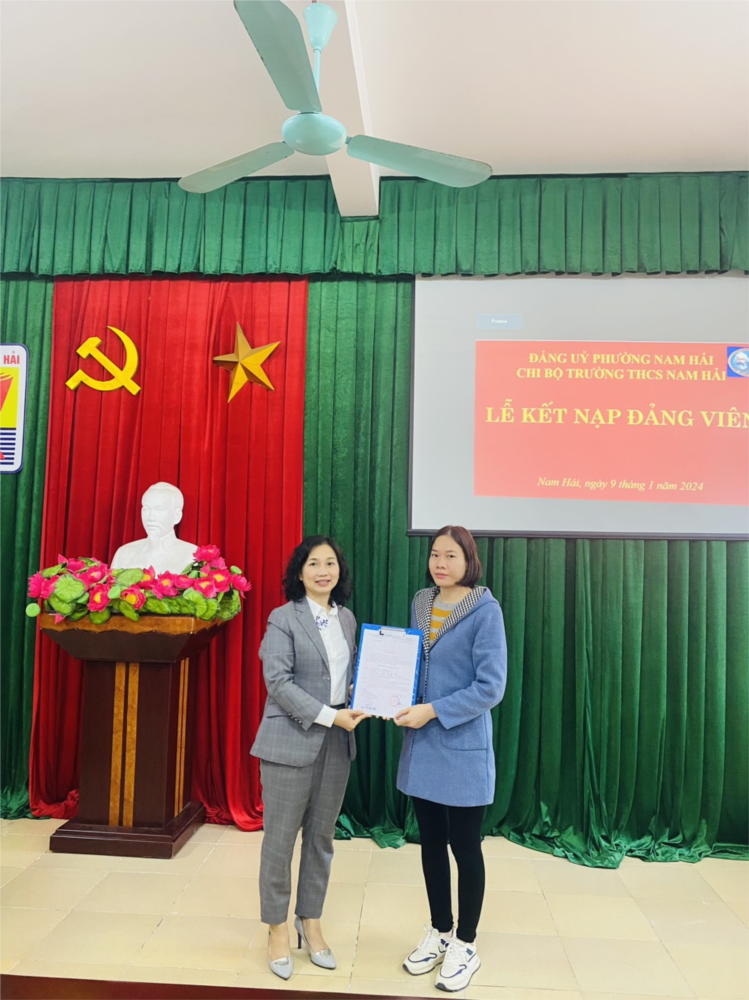 Chiều ngày 09/01/2024, Chi bộ trường THCS Nam Hải tổ chức kết nạp đảng viên đối với 02 quần chúng ưu tú cô giáo Vũ Thị Nhung, cô giáo Phạm Ngọc Anh là giáo viên tổ Khoa học Tự nhiên nhà trường.