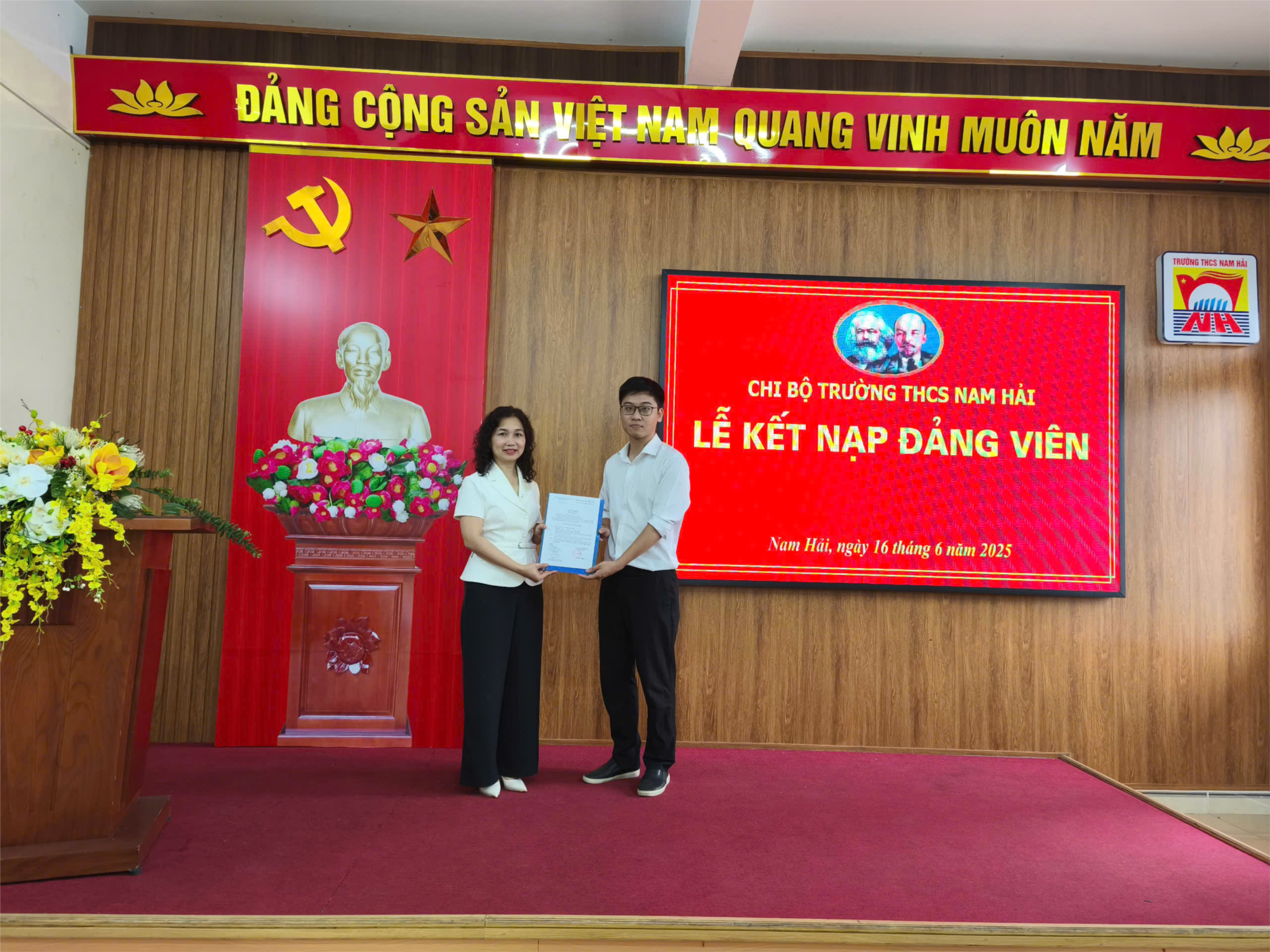 Sáng ngày 16/6/2025, Chi bộ trường THCS Nam Hải tổ chức kết nạp đảng viên đối với 01 quần chúng ưu tú Phạm Duy Mạnh là giáo viên nhà trường vào Đảng Cộng sản Việt Nam. Dự lễ kết nạp có đ/c Khoa Thị Thu Thủy-Bí thư chi bộ, Hiệu trưởng nhà trường cùng các đ/c đảng viên.