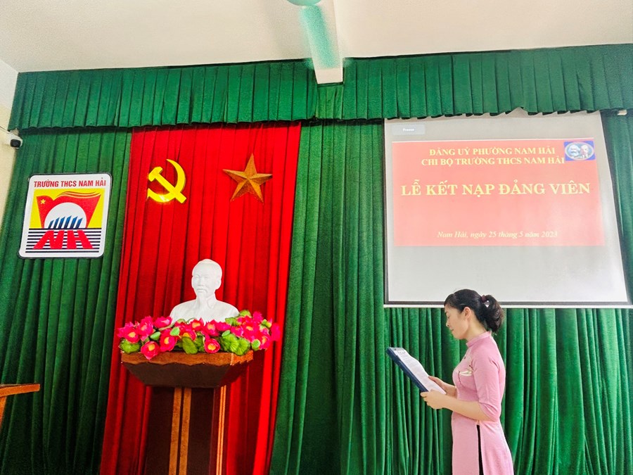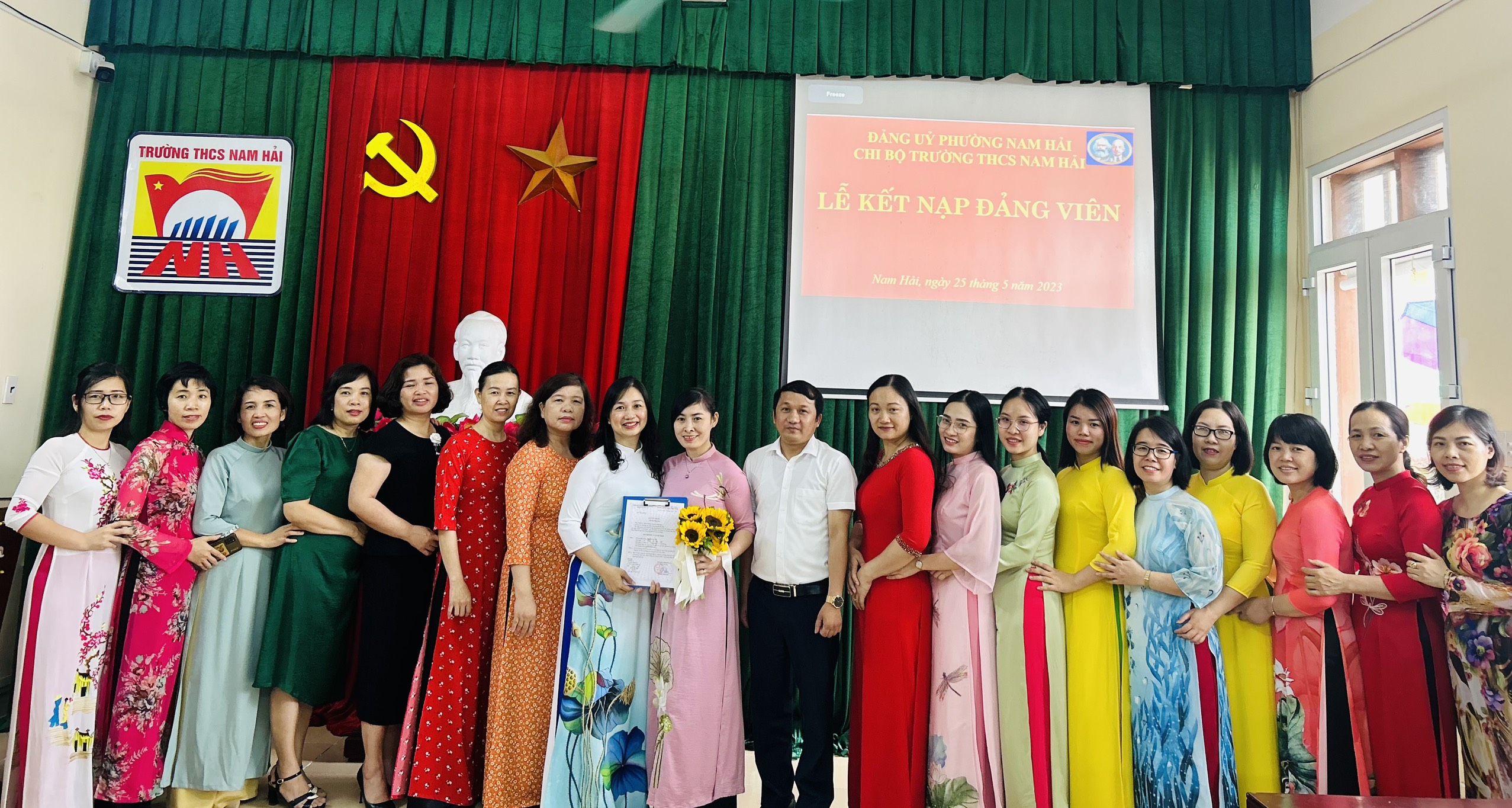 Ngày 25-5, Chi bộ trường THCS Nam Hải tổ chức kết nạp đảng viên đối với 01 quần chúng ưu tú là giáo viên nhà trường. Dự lễ kết nạp có đ/c Khoa Thị Thu Thủy-Bí thư chi bộ, Hiệu trưởng nhà trường cùng các đ/c đảng viên.