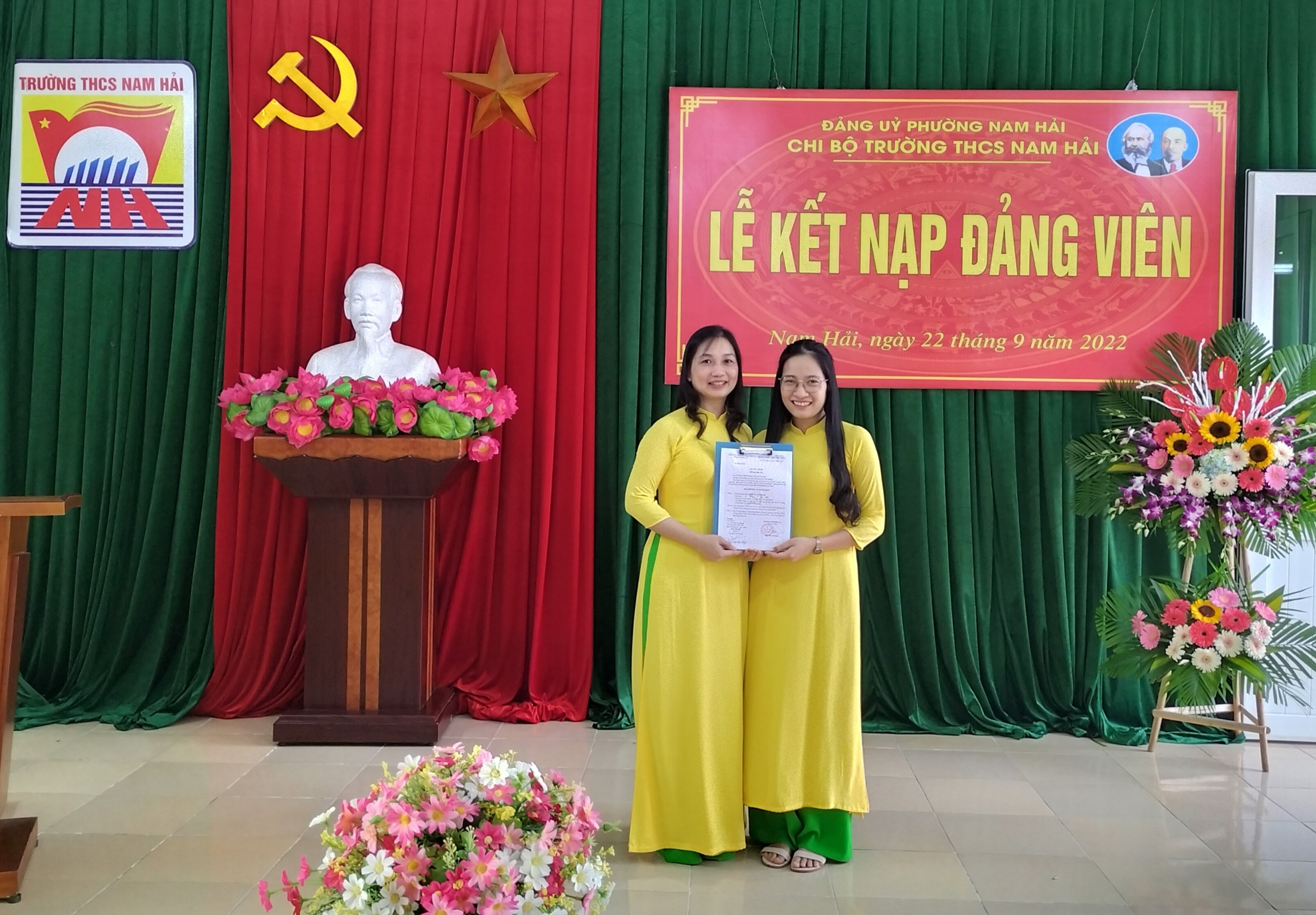Thi hành Điều lệ Đảng cộng sản Việt Nam, thực hiện Quyết định của Ban thường vụ quận ủy Hải An, chiều ngày 22/9/2022, Chi bộ Trường THCS Nam Hải tổ chức Lễ kết nạp Đảng viên mới cho quần chúng ưu tú Đoàn Thị Thu Hương vào Đảng theo quy định của Điều lệ Đảng.